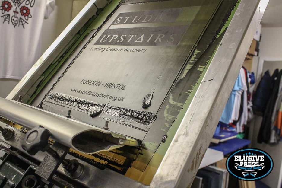 We screen printed these tote bags for London/Bristol based creative recovery organisation ‘Studio Upstairs’. Using 100% cotton tote bags we screen printed the logo on the front of the bags using an oil based plastisol ink.
